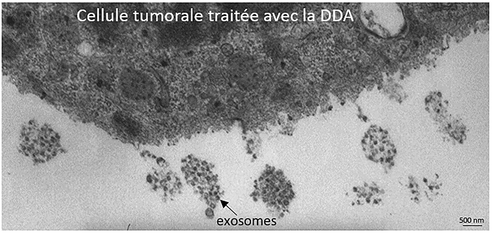 ©Sandrine Silvente-Poirot Figure: Transmission electron microscopy of a tumour cell treated with dendrogenin A. Treatment of tumour cells with dendrogenin A (DDA), a cholesterol derivative, activates a new pathway for the release of small vesicles of 30 to 150 nm, called exosomes, which stimulate the immune system against the tumour and block tumour progression.