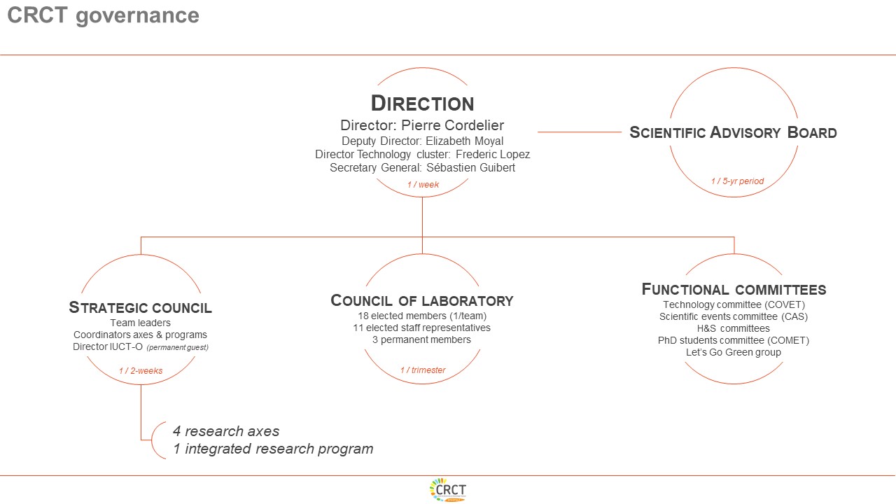 To ensure the success of his management project, Pierre Cordelier has surrounded himself with leading scientific figures who are experts in the fields of transfer research, transdisciplinarity and technology. Professor Elizabeth Cohen-Jonathan Moyal is head of the radiotherapy department at the Toulouse-Oncopole University Cancer Institute and of the RADOPT research team at the CRCT, and is deputy director in charge of clinical affairs. Dr Frédéric Lopez, Director of the CRCT’s Technology Unit, is in charge of technological issues. Sébastien Guibert, Administrative Secretary General, is responsible for the CRCT’s support services.