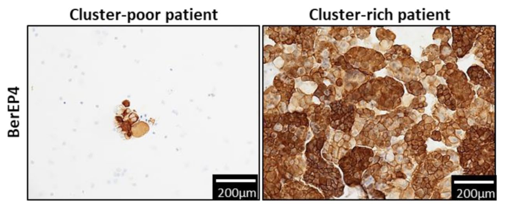 Figure A: There are two categories of ovarian cancer bearing patients depending on their number of cell clusters in the ascites: cluster-poor and cluster-rich patients. BerEP4 = epithelial cell marker, corresponding to the tumor cells in the ascites.