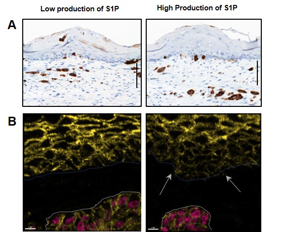 3D reconstructed skin model containing melanomas producing variable amounts of sphingosine 1-phosphate (S1P). (A) Immunohistochemistry showing that high production of S1P by melanoma cells (brown) is associated with greater dermal invasion (B) Immunofluorescence showing that high production of S1P by melanoma cells (red) is associated to a decrease in E-cadherin expression (yellow) in the adjacent epidermis.
