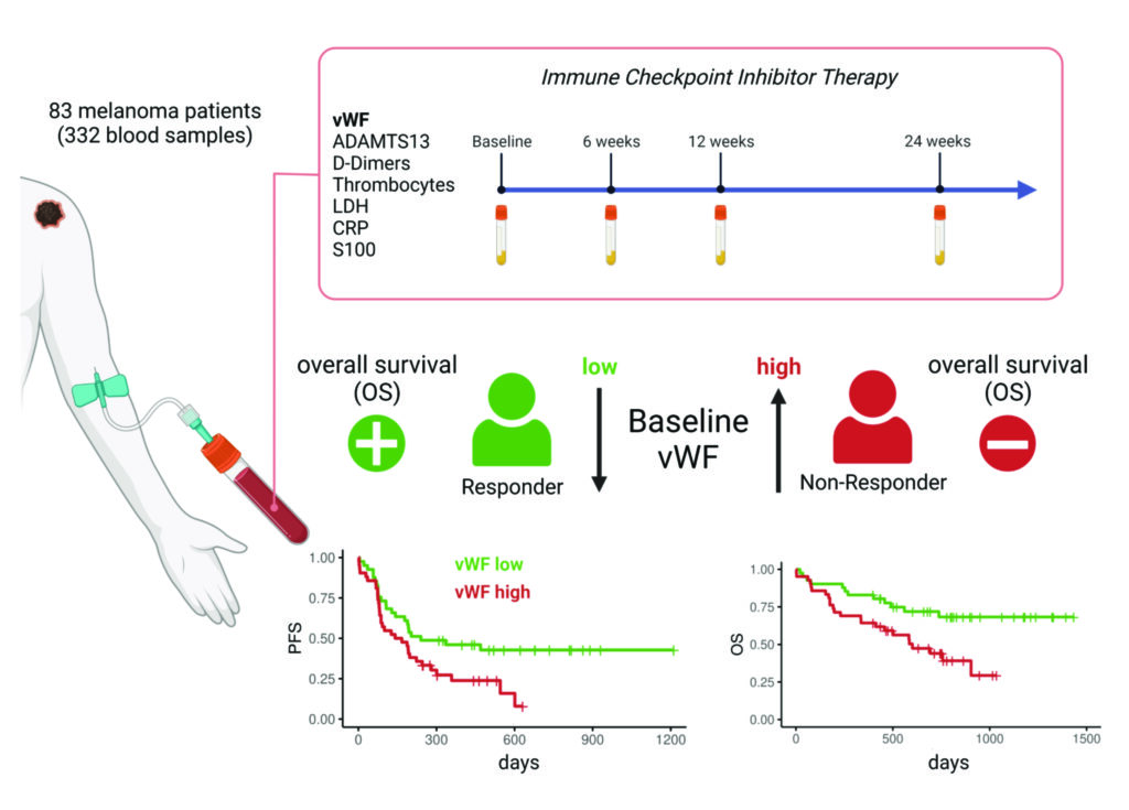 In this prospective cohort, coagulatory parameters such as ADAMTS13 activity and D-dimers are associated with overall survival (OS) but baseline vWF:Ag levels appeared as the only parameter associated with response and OS to ICI. This highlights a potential role of vWF as a biomarker to monitor ICI response of patients with malignant melanoma.