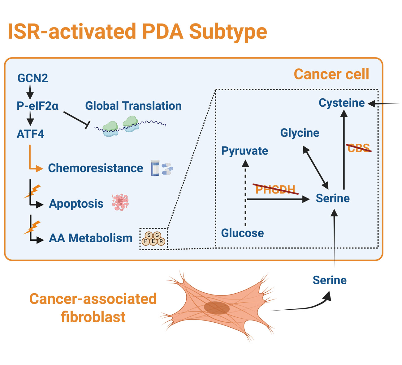 Résumé graphique : Le profilage du traductome met en évidence le sous-type PDAC ISR-act, qui se caractérise par l’activation constitutive de la voie de réponse intégrée au stress (ISR), entraînant une inhibition globale de la traduction des protéines ainsi que la traduction sélective de facteurs liés au stress tels que l’ATF4. Cette activation de l’ISR est due à la perte de PHGDH et de CBS, deux enzymes clés nécessaires à la biosynthèse de la sérine et de la glycine, des acides aminés essentiels à de nombreuses fonctions cellulaires. Les fibroblastes associés au cancer dans le microenvironnement tumoral compensent en fournissant de la sérine, révélant ainsi des vulnérabilités thérapeutiques et ouvrant de nouvelles possibilités de ciblage pour ce sous-type hautement chimiorésistant.