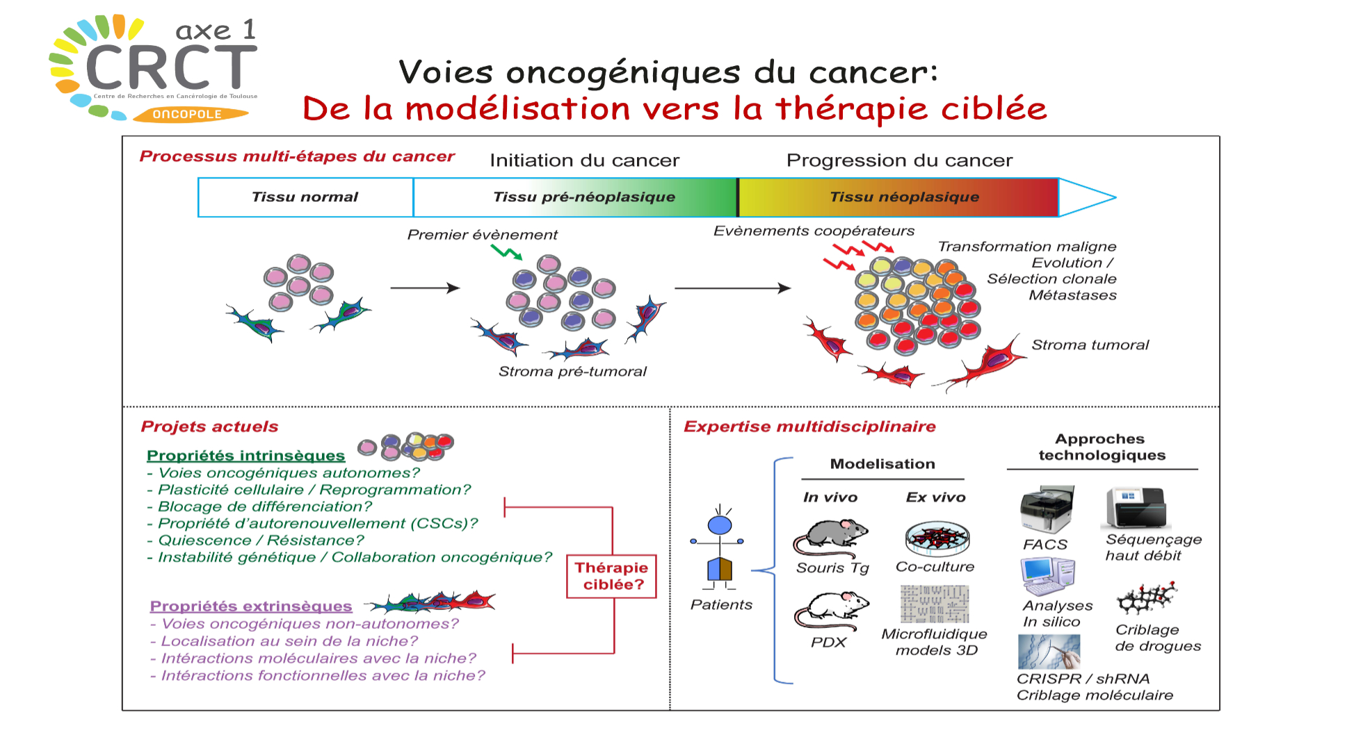 L’objectif de cet Axe 1 est de fédérer chercheurs, membres d’équipes et étudiants du CRCT autour d’une thématique intitulée “Voies oncogéniques du cancer: De la modélisation vers les thérapies ciblées”, afin de partager une expertise multidisciplinaire incluant l’utilisation de souris transgéniques ou de modèles de xénogreffes, d’expériences fonctionnelles in vitro et in vivo sur cellules primaires, de séquençage de nouvelle génération associé à des analyses bio-informatiques, d’approches de criblages chimiques ou moléculaires, avec l’objectif commun de comprendre et de cibler les mécanismes autonomes et non-autonomes des voies oncogéniques du cancer.