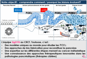 Depuis plus de dix ans, l’équipe a montré que la voie PI3K est essentielle au développement du cancer du pancréas. En étudiant son rôle dans la progression tumorale et la formation des métastases, l’équipe conçoit et valide de nouvelles stratégies thérapeutiques. Cela inclut l’évaluation de médicaments ciblant PI3K, seuls ou en combinaison avec des immunothérapies ou des mécanothérapies.