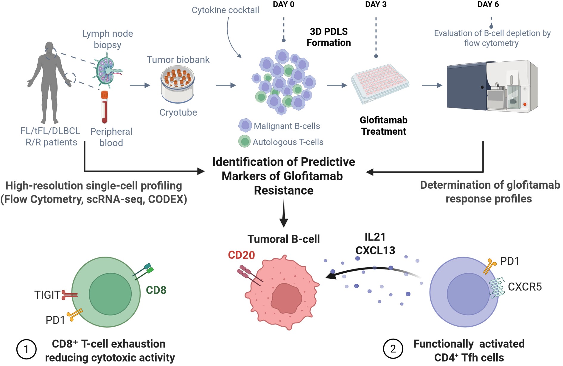 A partir de modèles 3D dérivés d’échantillons de patients atteints de lymphome B, l’équipe NoLymit a identifié des mécanismes de résistance au glofitamab (CD20xCD3) validés par des approches fonctionnelles. La réponse est associée à un microenvironnement tumoral riche en CD8+ activés et cytotoxiques alors que la résistance implique des CD8+ épuisés et de nombreuses cellules T follicular helper (Tfh) cells fonctionnellement activées. Enfin, chez un sous groupe de patients traités en vie réelle par CD20XCD3, la réponse mesurée dans les PDLS corrèle fortement avec la réponse clinique, suggérant un potentiel prédictif.