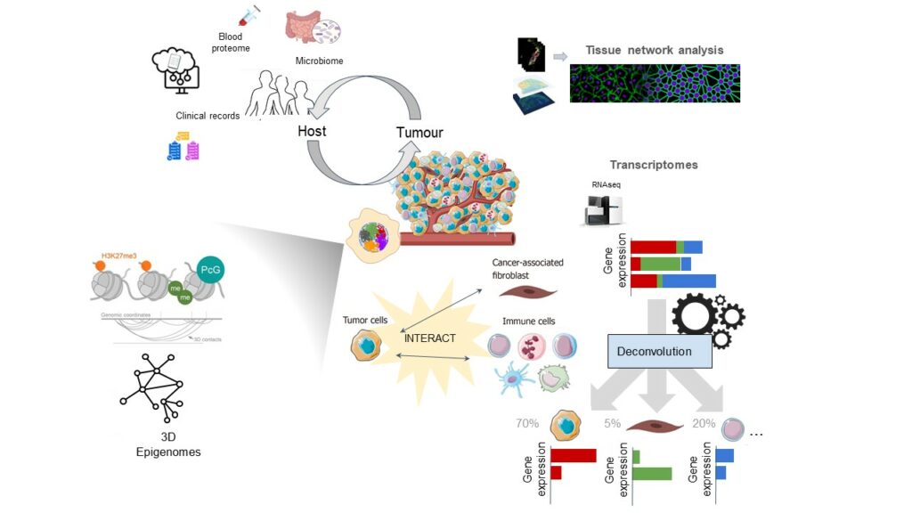 Notre équipe développe des outils pour analyser les données hautement complexes générées par ces méthodes, et nous pensons que les réseaux fournissent une méthode puissante pour analyser les expériences omiques spatiales. La bibliothèque tysserand peut reconstruire des réseaux spatiaux à partir d’expériences omiques résolues spatialement, et la bibliothèque mosna (Multi Omics Spatial Networks Analysis) fournit des méthodes pour analyser ces réseaux spatiaux afin d’étudier les interactions cellule-cellule et de trouver des composantes cellulaires voisines pouvant avoir un intérêt clinique potentiel. - Étude des épigénomes 3D des cellules cancéreuses et autres cellules dans le MET (cellules immunitaires, fibroblastes associés au cancer) pour mettre en évidence le couplage entre le contexte tissulaire, les paysages épigénomiques et les états de différenciation.