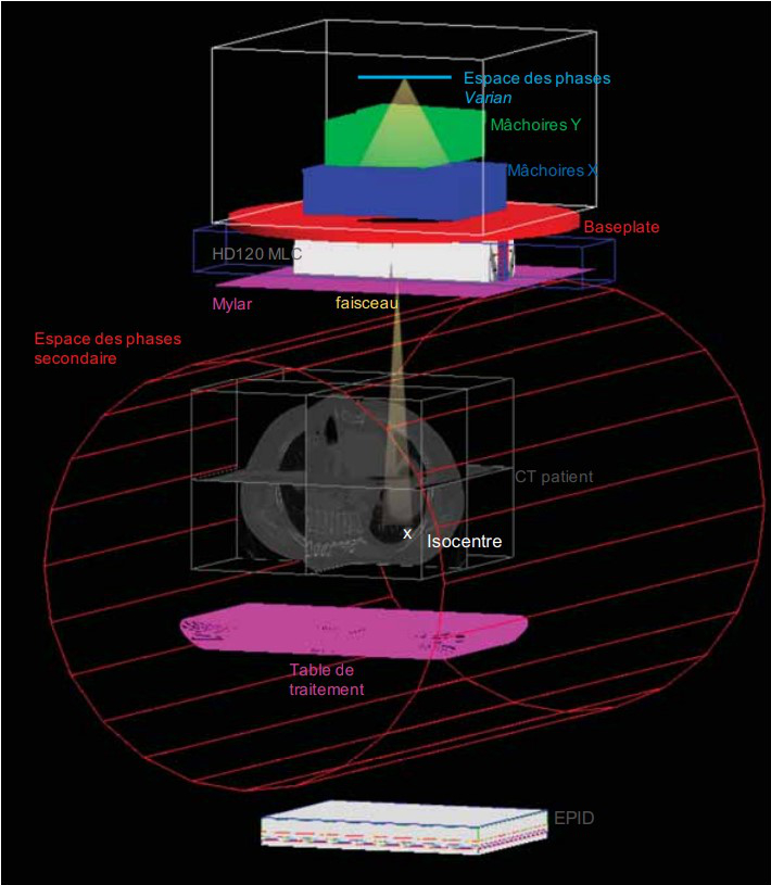 Example of radiotherapy modelling with GAMMORA. All elements of the machine head are modelled. A CT scan of a patient with bronchial cancer is used here.