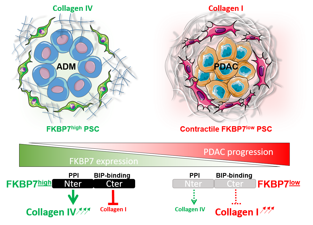 Fibroblasts associated with pancreatic cancer belong to a heterogeneous population that may have pro- or anti-tumoral roles. In order to target them, it is important to understand the biology of each subtype. We have discovered a subtype of CAFs with anti-tumor properties and shown that the underlying mechanism involves an endoplasmic reticulum chaperone protein, FKBP7. This protein promotes the production and secretion of type IV collagen in the basal lamina, which plays a role in tissue homeostasis. On the contrary, it blocks the production of fibrillar, pro-tumor type I collagen.