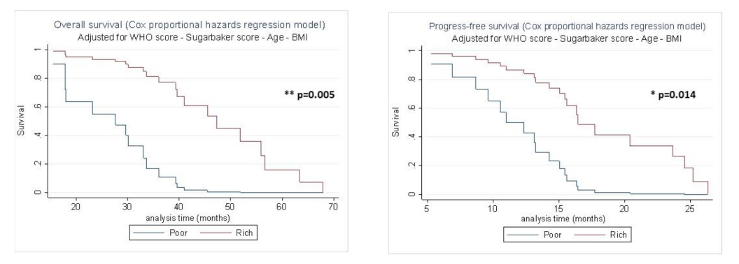 Our retrospective study shows that a low number of neoplastic cell clusters in ascites is associated with shorter overall and progression-free survival in high-grade ovarian cancer.