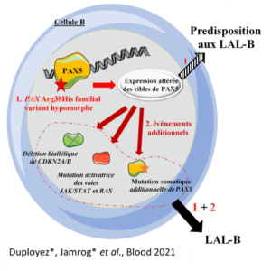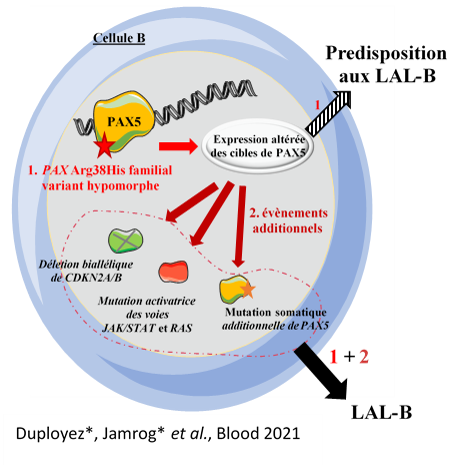 Nous avons identifié en collaboration avec le CHU de Lille, la mutation PAX5R38H dans une famille dans laquelle les trois enfants ont développé une leucémie aiguë lymphoblastique de type B (LAL-B) (Duployez, Jamrog et al., Blood 2021). PAX5 est un facteur central dans la production des lymphocytes B fonctionnels (Cresson et al., Oncotarget 2018) et souvent altéré de façon somatique dans les LAL-B (Familiades et al., Leukemia 2009 ; Coyaud et al., Blood 2010 ; Jamrog et al., PNAS 2018). Nous avons récemment montré que le mutant PAX5R38H perd la fonctionnalité de PAX5 bloquant les lymphocytes B à des stades très précoces mais réacquiert des propriétés pouvant expliquer l’initiation leucémique. Nous avons également montré que la transformation nécessite une altération des voies Ras et Jak/Stat.