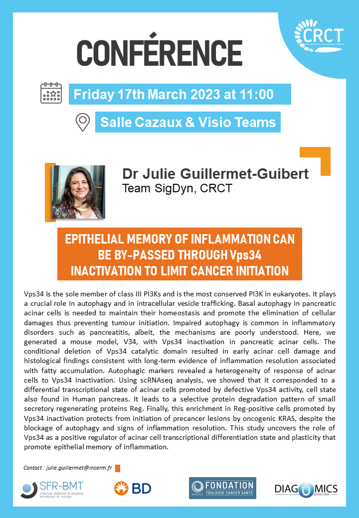 Conférence CRCT – Epithelial memory of inflammation can be by-passed through Vps34 inactivation to limit cancer initiation. Présenté par Dr Julie Guillermet-Guibert (équipe SigDyn)