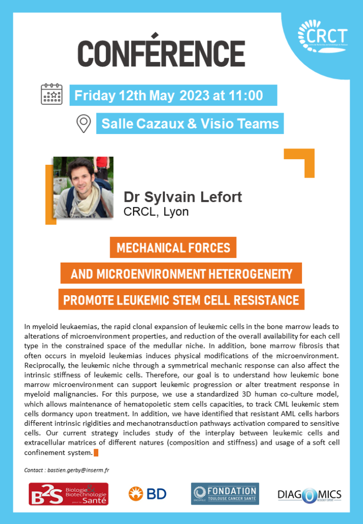 Tout au long de mes travaux de recherche, j’ai cherché à identifier des mécanismes intrinsèques et extrinsèques essentiels à l’homéostasie, à l’initiation et la progression tumorale. Ainsi durant mon PhD (2005-2009), j’ai identifié des mécanismes consécutifs à l’infection par KSHV permettant l’établissement de la pathologie et de la tumorigénèse. J’ai ensuite rejoint l’Institut Curie (2009-2013), où mes travaux ont permis d’identifier des cibles thérapeutiques tumorales ou microenvironnementales spécifiques de sous−types de cancer du sein. Au sein du laboratoire Terry Fox (2014-2017), mes travaux sur les cellules souches et progénitrices mammaires humaines ont permis d’étudier le rôle de plusieurs déterminants moléculaires, tels que YB−1 et YAP, impliqués dans l’initiation tumorale. Ayant rejoint le CRCL en 2017, je m’intéresse dorénavant au rôle des contraintes mécaniques, via les éléments mécanosenseurs BMP et YAP, dans le maintien des cellules souches hématopoïétiques et leucémiques via leur interaction avec leur microenvironnement.