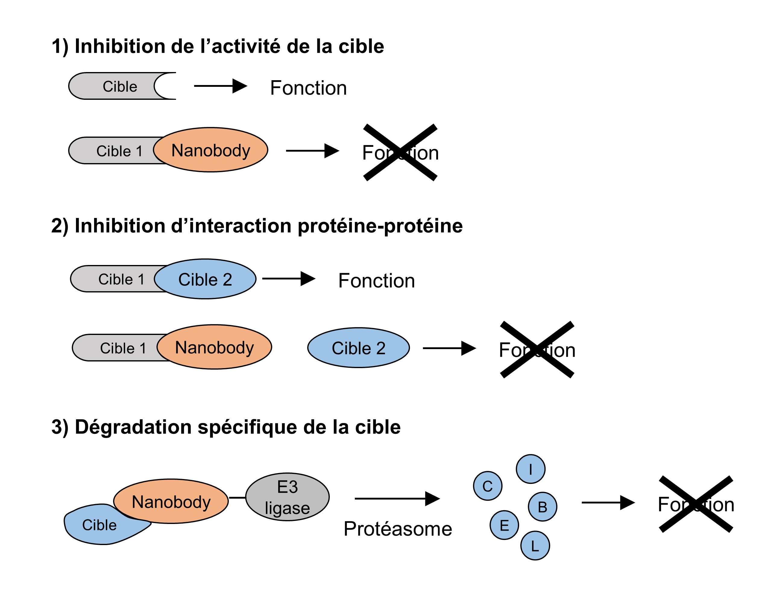 En réponse aux thérapies anti-cancéreuses, des voies de signalisations peuvent être activées et induire une résistance des cellules cancéreuses à ces traitements. Ces voies sont généralement régulées par des oncoprotéines et des interactions protéine-protéine. Notre projet consiste à déterminer les mécanismes moléculaires contrôlant la résistance des tumeurs pancréatiques, en identifiant et inhibant des (onco)protéines et/ou des interactions protéine-protéine cibles. Pour cela, nous développons des méthodes et outils innovants basés sur la technologie des anticorps intracellulaires. Ces anticorps dérivent du domaine variable d’immunoglobulines à simple chaine lourde de camélidés et sont appelés « nanobody ». Ils se lient de façon spécifique à leur cible et peuvent ainsi bloquer leur(s) fonction(s) dans les cellules. Il est également possible de fonctionnaliser ces anticorps avec des molécules effectrices. Par exemple, les anticorps dégradeurs sont fusionnés à une E3 ubiquitine ligase pour induire la dégradation spécifique de leur cible. En utilisant ces technologies, nous inhibons à façon des médiateurs de voies de signalisation afin de définir l’implication de ces dernières dans la résistance des cellules cancéreuses pancréatiques.