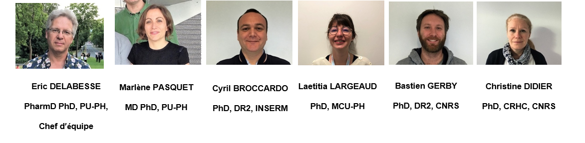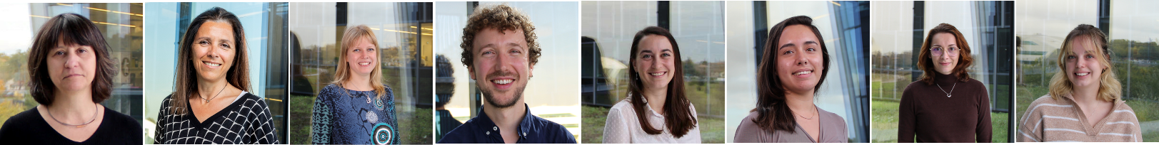 De gauche à droite : Fabienne MEGGETTO, DR1 CNRS, Laurence LAMANT, PU-PH CHU de Toulouse, Loélia BABIN, chercheuse post-doctorante, Steffen FUCHS, chercheur post-doctorant, Chloé BESSIERE, chercheuse post-doctorante, Elissa ANDRAOS, étudiante en thèse, Sandra DAILHAU, ingénieure de recherche, Lola COLRAS, ingénieure d’étude.