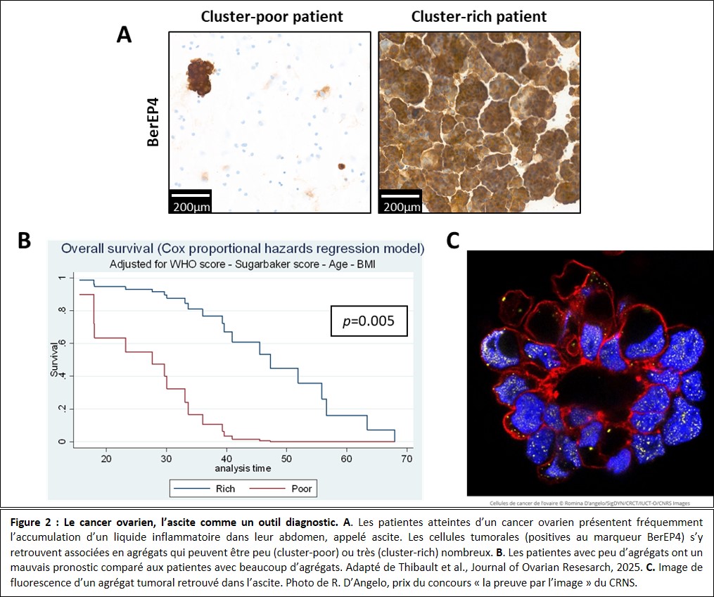Le cancer ovarien se caractérise par une détection à stade tardif où la maladie s’est déjà disséminée dans le péritoine et cause, dans la majorité des cas, l’accumulation d’un liquide inflammatoire appelé ascite. Ce matériel, facile à prélever, est pour le moment sous-utilisé en clinique. L’équipe SigDyn du CRCT (dirigée par Julie Guillermet-Guibert) a récemment montré qu’imager ces ascites permet de visualiser le nombre d’agrégats tumoraux qui s’y trouvent, et que leur nombre permettrait de prédire la survie des patientes (Thibault et al., Journal of Ovarian Research, 2025)(Figure 2). Ces résultats doivent être confirmés dans une étude prospective sur un nombre plus important de patientes. Ils ouvrent la voie à l’utilisation de l’ascite comme outil diagnostic pour les patientes atteintes d’un cancer ovarien.