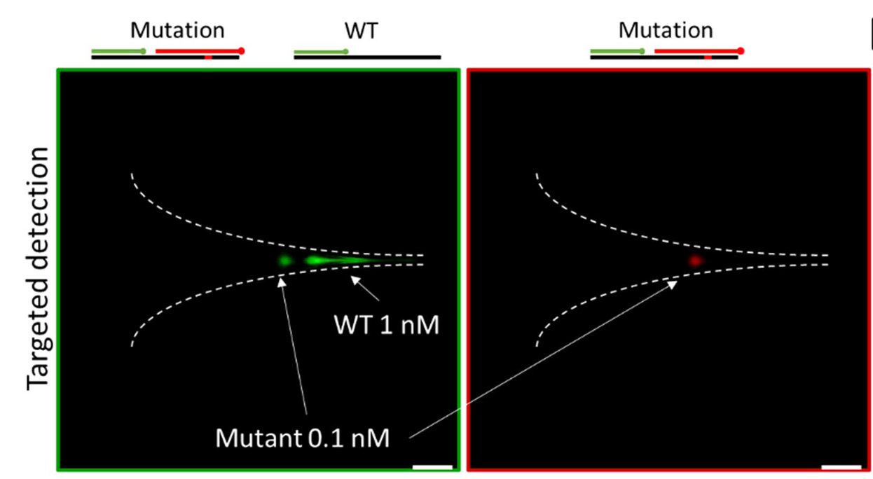 Détection de mutations dans le gène codant pour le récepteur de l’EGFR en 3 minutes grâce à la concentration et à la séparation d’ADN. Les sondes fluorescentes utilisées reconnaissent le gène du récepteur de l’EGFR (vert, gauche, témoin interne) ou spécifiquement la mutation L858R (rouge, droite)